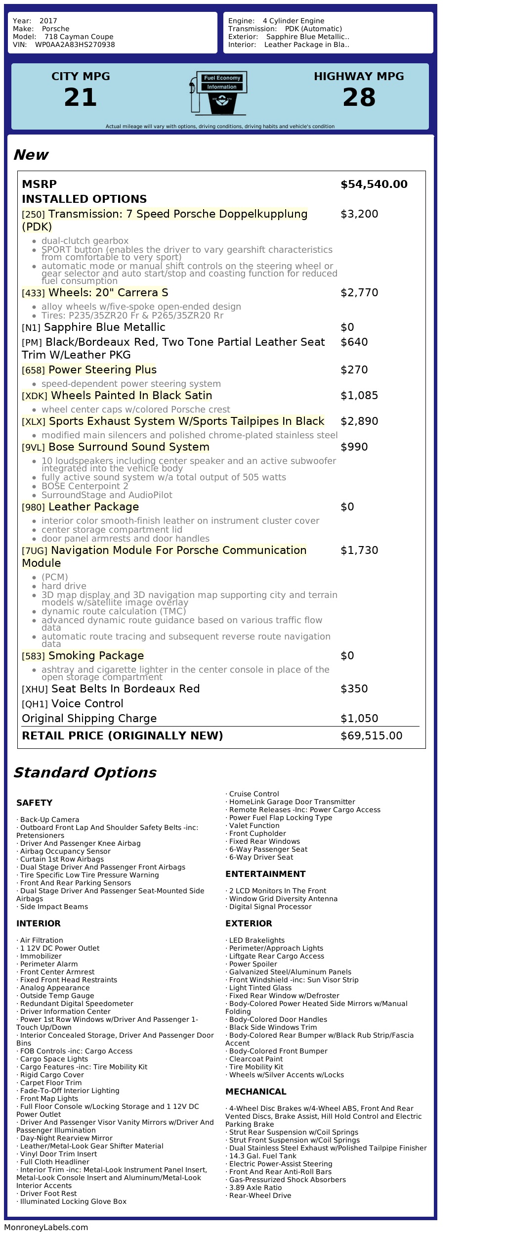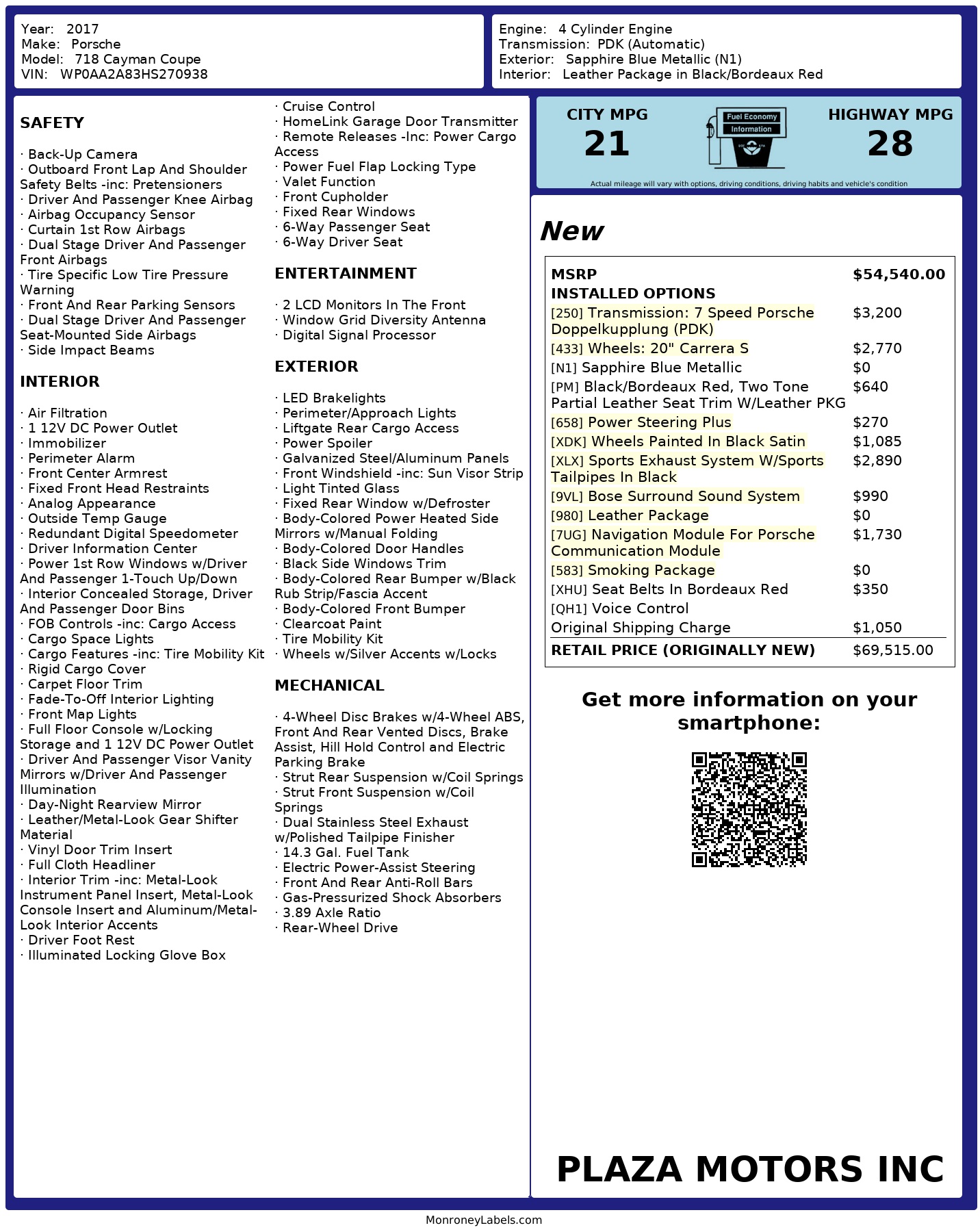 2017 Porsche 718 Cayman. 2.0L Turbo / 300 HP, 7-Speed PDK Automatic Transmission. Sapphire Blue Metallic with Black/Bordeaux Red leather interior. Original MSRP $69,515. Nicely optioned with Navigation, Bose Surround Sound, SAT/HD Radio, Bluetooth, Streaming Audio, Universal Garage Door Opener, Power Steering Plus, Front and Rear Parking Sensors, Back-Up Camera, Dual Mode Sports Exhaust w/Black Tailpipes and 20 inch Carrera S Alloy Wheels in Satin Black. Clean Car Fax. Runs and drives really nice. We have Financing and Extended Warranties available. Please give us a call or visit our website at www.plazamotorsaz.com for more information.