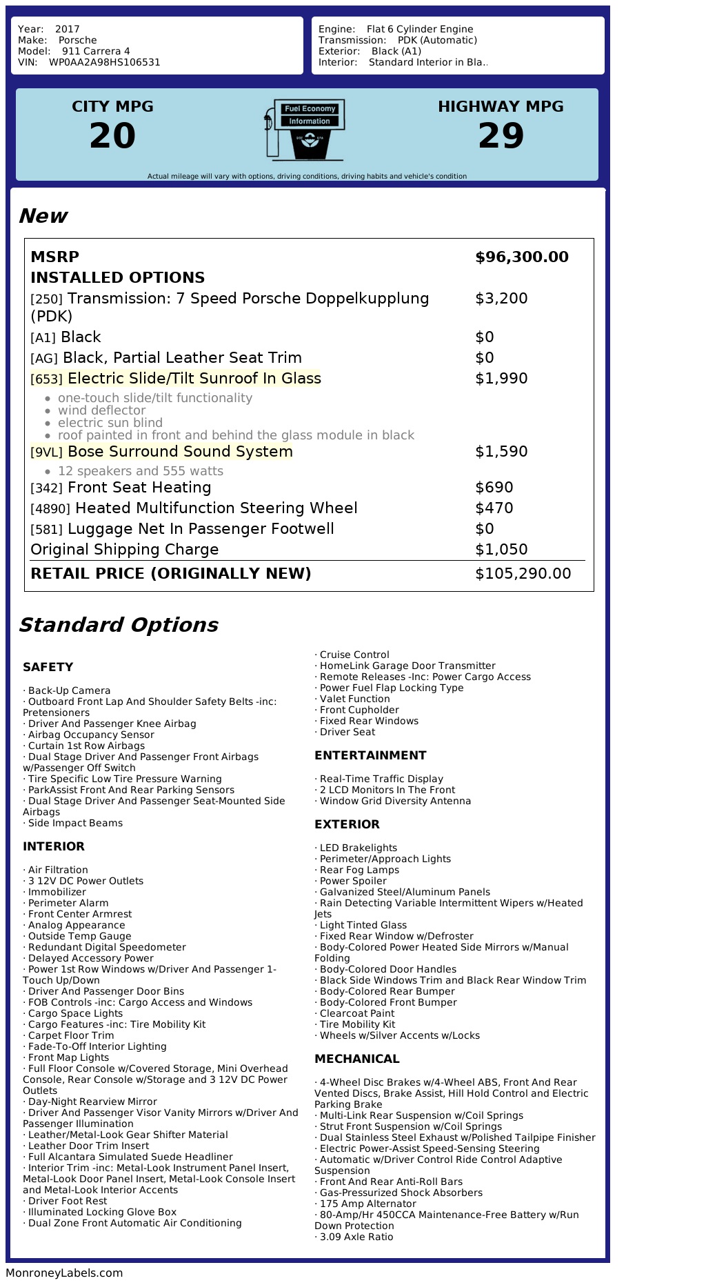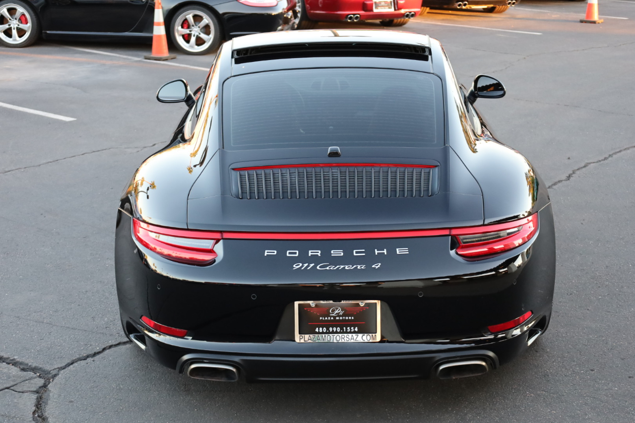 2017 Porsche 911 Carrera 4. 3.0L Turbo / 370 HP, 7-Speed PDK Automatic Transmission. Black with Black leather interior. Original MSRP $105,290. Nicely optioned with Apple Car Play, Navigation, Bose Surround Sound, SAT/HD Radio, Heated Multi Function Steering Wheel, Heated Seats, Universal Garage Door Opener, Electric Slide/Tilt Sunroof in Glass, Xenon Headligths, Front and Rear Parking Sensors, Back-Up Camera, AGT Coilovers, Performance Exhaust, Wheel Spacers and 19 inch Alloy Wheels. Runs and drives great. We have Financing and Extended Warranties available. Please give us a call or visit our website at www.plazamotorsaz.com for more information.