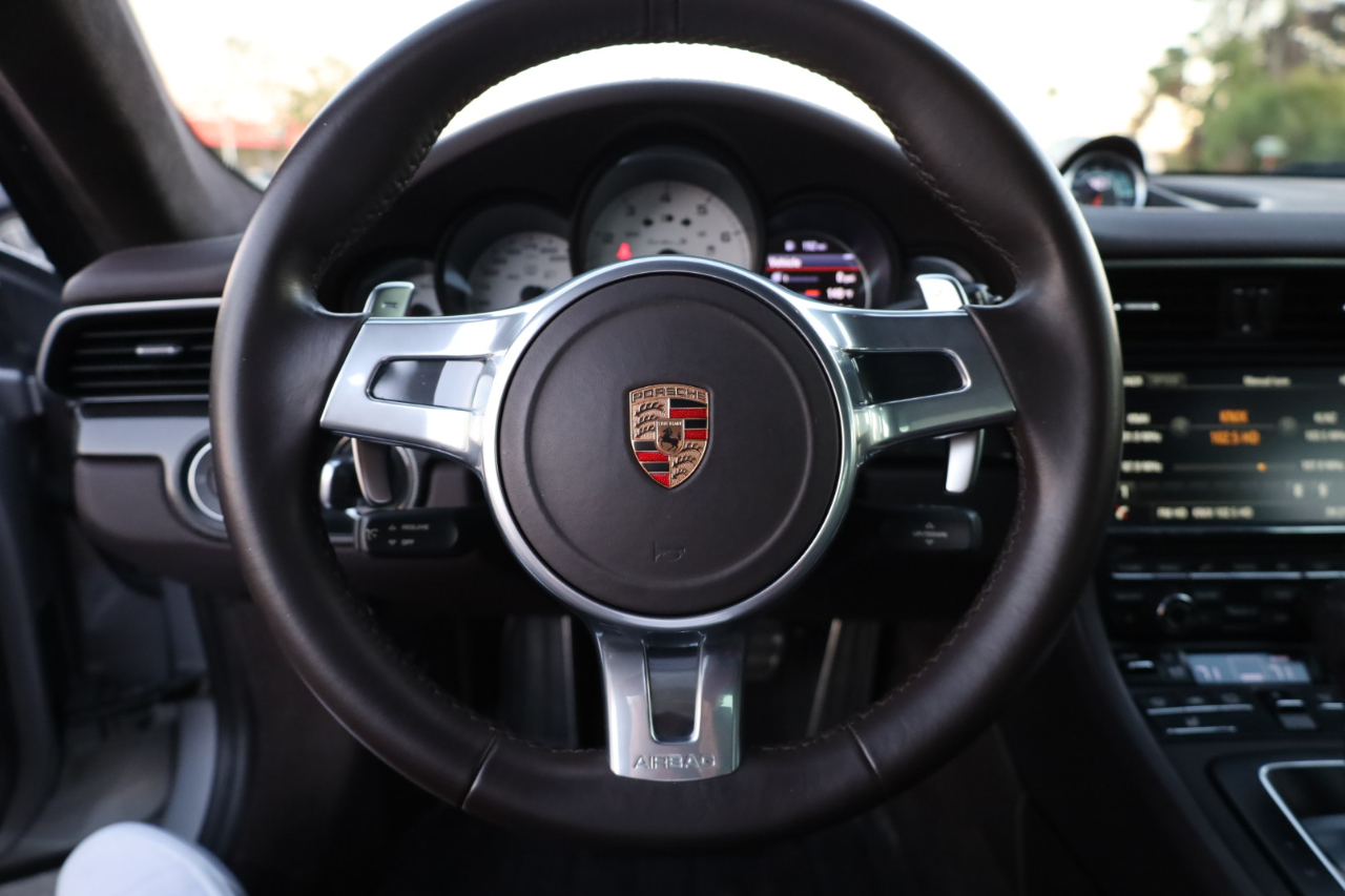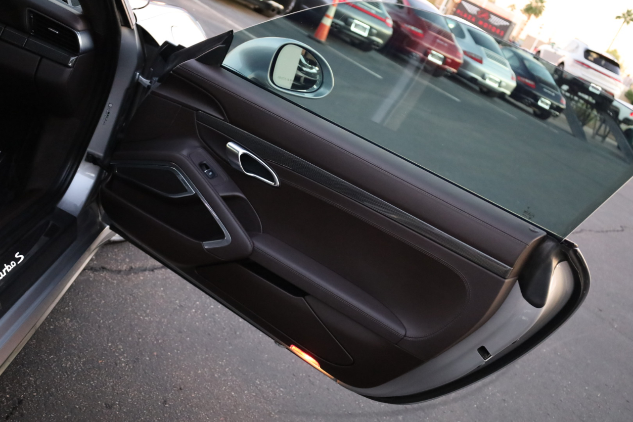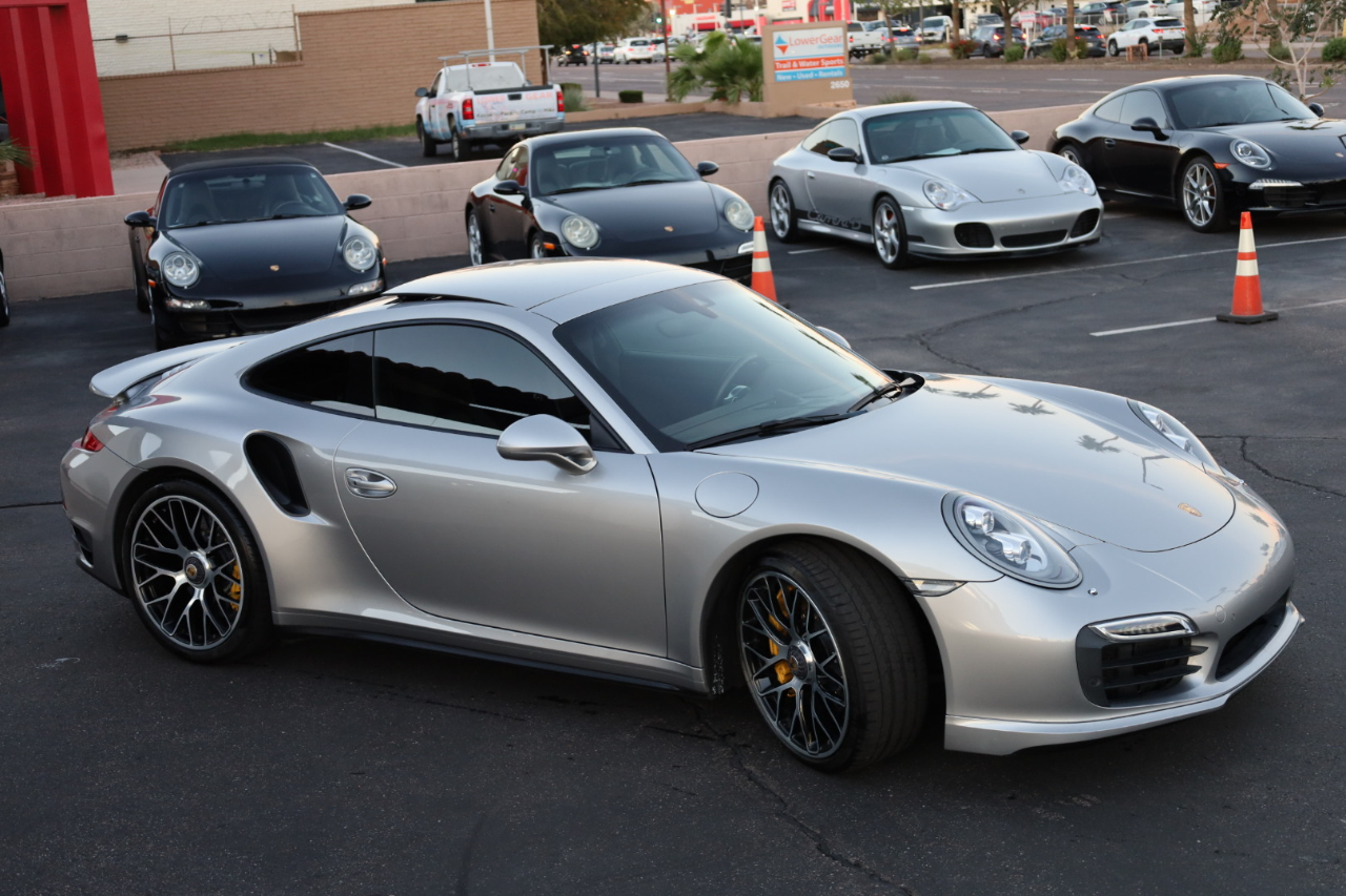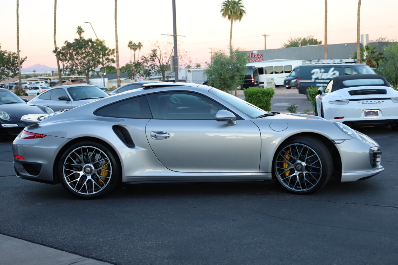 2014 Porsche 911 Turbo S. 3.8L Twin Turbo H-6 / 560 HP, 7-Speed PDK Automatic Transmission. GT Silver Metallic w/Espresso Full Natural Leather Interior w/Carbon Fiber Trim. Original MSRP $196,980. Nicely optioned with Navigation, Burmester High-End Surround Sound, SAT/HD Radio, Bluetooth, Streaming Audio, 14-Way Power Memory Seats, Heated Seats, Sport Design Steering Wheel, Porsche Crest in Headrest, Instrument Dials in White, Sport Chrono Package, PDCC, Fire Extinguisher, Light Design Package, Power Sunroof, Power Steering Plus, Gear Selector in Carbon Fiber, Center Console Trim in Leather, Porsche Entry Drive, Illuminated Door Sills in Carbon Fiber, Front and Rear Parking Sensors, LED Headlights w/PDLS, Ceramic Brakes, and 20 inch Turbo S Center Lock Alloy Wheels. Super clean Porsche. Clean Car Fax. Excellent service history listed in the Car Fax. Runs and drives great. We have Financing and Extended Warranties available. Please give us a call or visit our website at www.plazamotorsaz.com for more information.